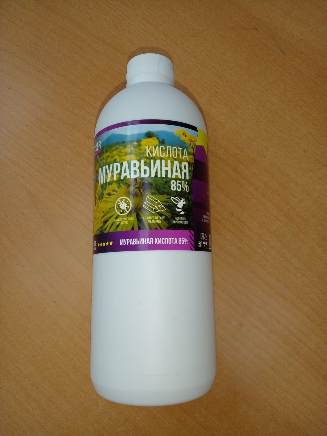 Для пчеловодов муравьиную кислоту (флакон 0,5 л) продаю | | Про варроатоз пчел сегодня знает любой пасечник. Это проблема любого пчеловода. Муравьиная кислота используется для обработки пчелиных семей против клеща варроа. Рекомендуется применять за курс лечения от 100 до 150 мл муравьиной кислоты. Для однократной обработки одной пчелиной семьи используется около 30-45 мл муравьиной кислоты. |