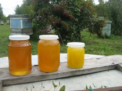 | Слева - ранний мёд, ещё жидкий; в центре - поздний, началась кристаллизация; справа - а такого было пару фляг всего, уже закристаллизовался....