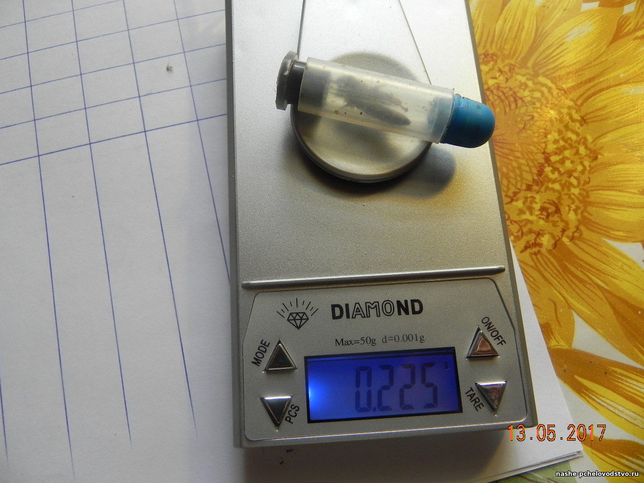 | Не раз читал о том, что матки теряют в весе после выхода из маточника, но нигде не попадалась информация о динамике этого процесса. Решил прояснить этот вопрос. В течение суток провёл 4 взвешивания. Утром в 9.00, потом в 13.00, в 17.00 и утром следующего дня в 9.00. Всего взвешено 64 неплодки. Результаты следующие: Максимальная масса в 1-ом взвешивании -257мг, минимальная - 181мг, средняя -207,6мг. Как и ожидалось, большинство маток потеряли в весе. Разница между 1-ым и 4-ым взвешиваниями максимальная -53мг, минимальная -1мг, средняя -20,5мг. А вот при взвешивании через 4 часа, как рекомендуется в различных источниках, эта разница оказалась меньшей, средняя - 8,8мг. Среднее похудание за ночь оказалось 11,7мг. Но были и сюрпризы. 8 маток во 2-ом взвешивании показали прибавку в весе, а три за время содержания в клеточке поправились, и значительно. От этой несложной работы получил массу интересных наблюдений и впечатлений. Ну и новые вопросы появились.