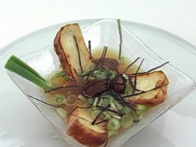Соевый сыр в сочетании с грибами.Состав:тофу — 150 гр;бульон «Даши» — 100 гр;шитаке — 4 гриба;белое вино — 1 чайная ложка;соевый соус — 1 чайная ложка;сахар — 1 столовая ложка;лук — 2 стебля;немного кукурузной муки и полосок нори;растительное масло по вкусу.