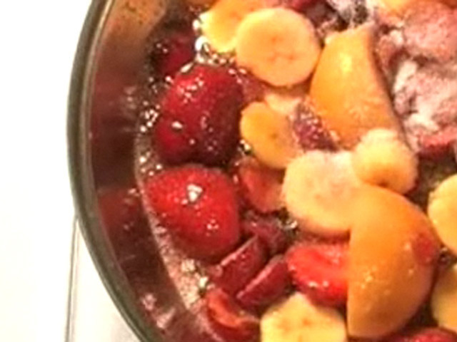Сделайте настоящее кулинарное шоу из обычного десерта!Состав:персики — 4 штуки;бананы — 2 штуки;вишня — 150 гр;клубника — 8 ягод;лимон — 1 штука;масло — 100 гр;сахар, бренди.
