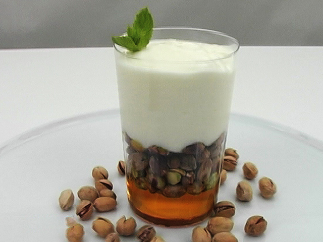 Разнообразие в десертной жизни вашей семьи.Состав:йогурт — 1 стакан;мед — 150 гр;сахар — 40 гр;вода — 1 столовая ложка;сливки — 1/2 стакана;фисташки — 1 стакана;желатин — 1 порция.