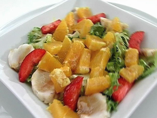 Салат из морского ангела с необычной заправкой.Состав:морской ангел — 100 гр;апельсин — 1 штука;клубника — 1 штука;несколько листьев салата;бальзамический уксус, оливковое масло, соль — по вкусу.