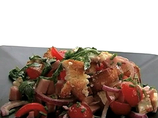 Простой салат из простых продуктов.Состав:лук — 1 штука;руккола — 1 пучок;помидоры-черри — 22 штуки;сыр из козьева молока — 100 гр;копченая ветчина — 2 кусочка;кленовый сироп, белый винный уксус, оливковое масло, морская соль, черный перец, бальзамический уксус, петрушка.