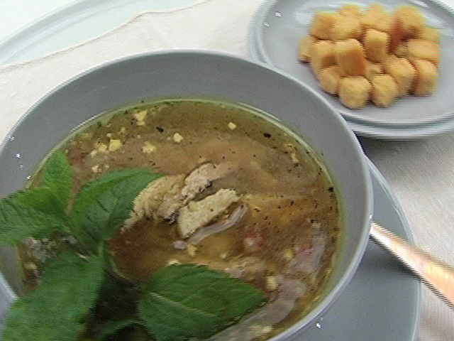 Новый суп на вашем столе.Состав:куропатка — 1 штука;куриный бульон — 200 гр;лук — 1 штука;ветчина — 100 гр;яйца — 1 штука;вода — 200 гр;шерри — 50 гр;чеснок — 1 зубчик;масло, соль с травами, мята, петрушка — по вкусу.